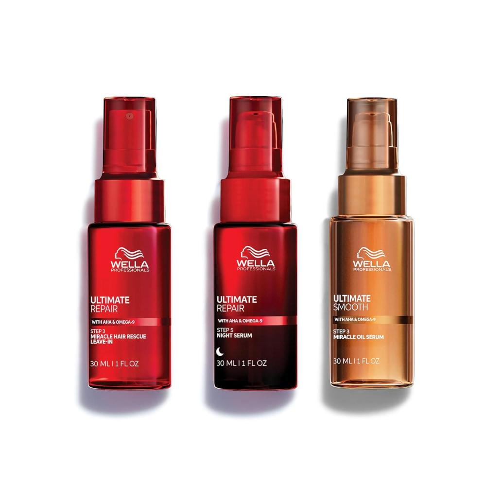 Wella Professionals ULTIMATE SMOOTH Miracle Oil Serum for Dry, Dull & Frizzy Hair + ULTIMATE REPAIR Night Hair Serum + Miracle Hair Rescue | For All Hair Types | 1 Fl Oz Travel Size Bundle